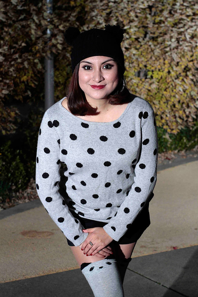 ...Moda divertida para navidad, hoy os traigo un look con calcetines largos de mujer para estos días festivos, Panda, con gorro de orejas.